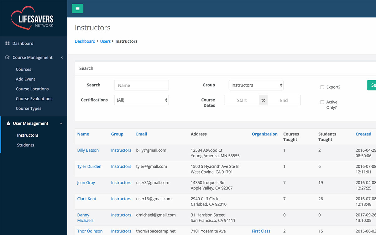 See how your instructors are performing, manage expiring certifications, and track evaluations. The LifeSavers Network not only provides a better way for Training Centers to coordinate with their instructors, it also gives opportunities for Instructors to promote themselves with instructor profile pages.